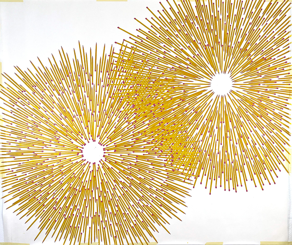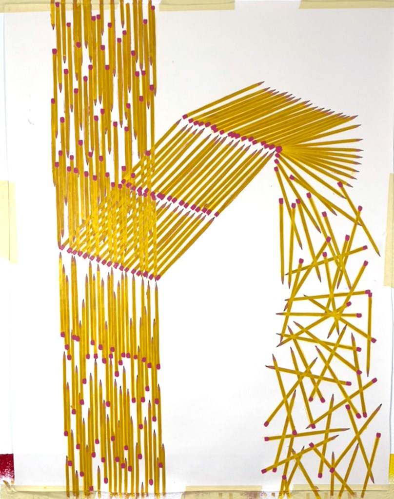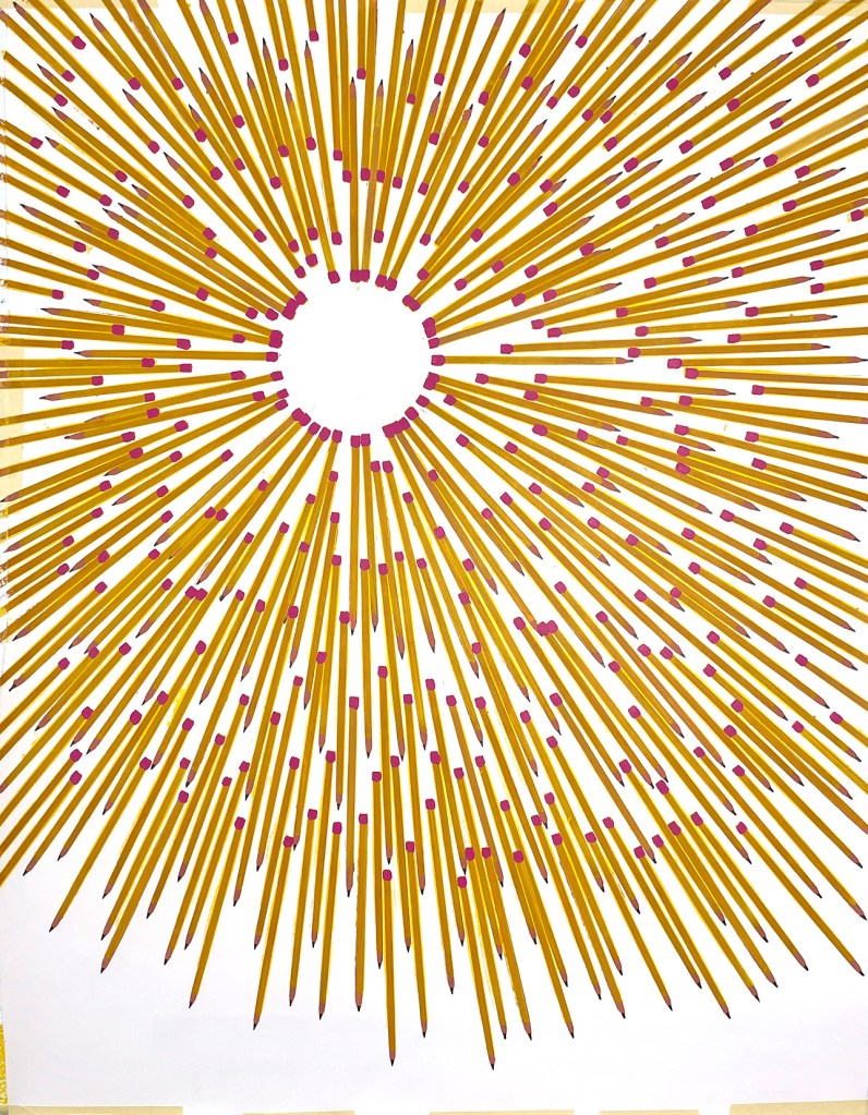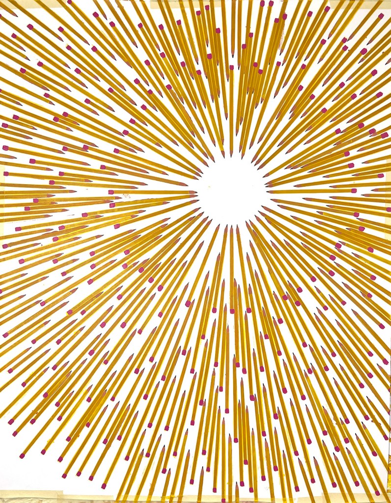 These pencils could be in motion, they could be a snapshot in time, or a physical structure that holds itself erect. There could be many pencils, or just different avenues in time of one pencil. They could be fulfilling personal micro-narratives, or working towards a larger history. Or, it could just be a whole lot of pencils.