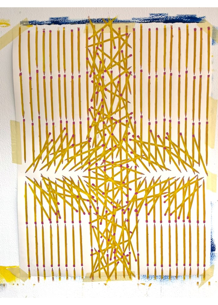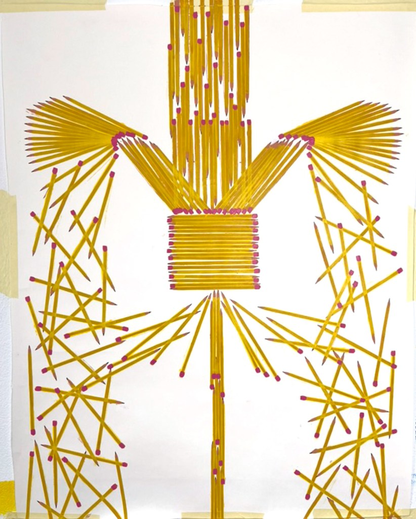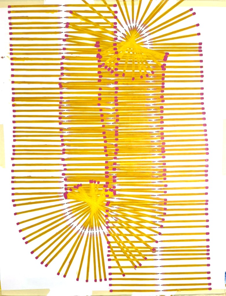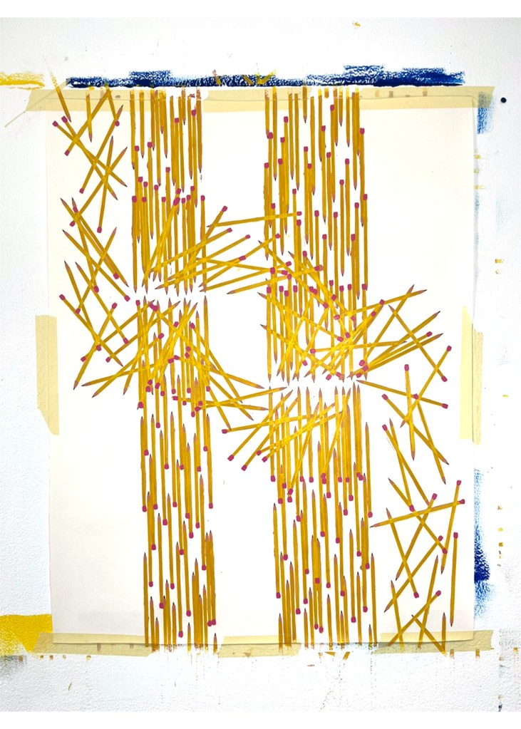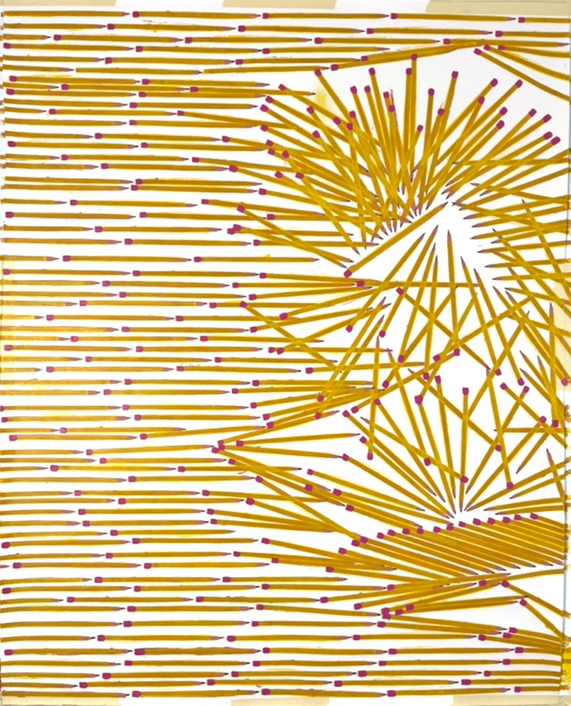 These pencils could be in motion, they could be a snapshot in time, or a physical structure that holds itself erect. There could be many pencils, or just different avenues in time of one pencil. They could be fulfilling personal micro-narratives, or working towards a larger history. Or, it could just be a whole lot of pencils.