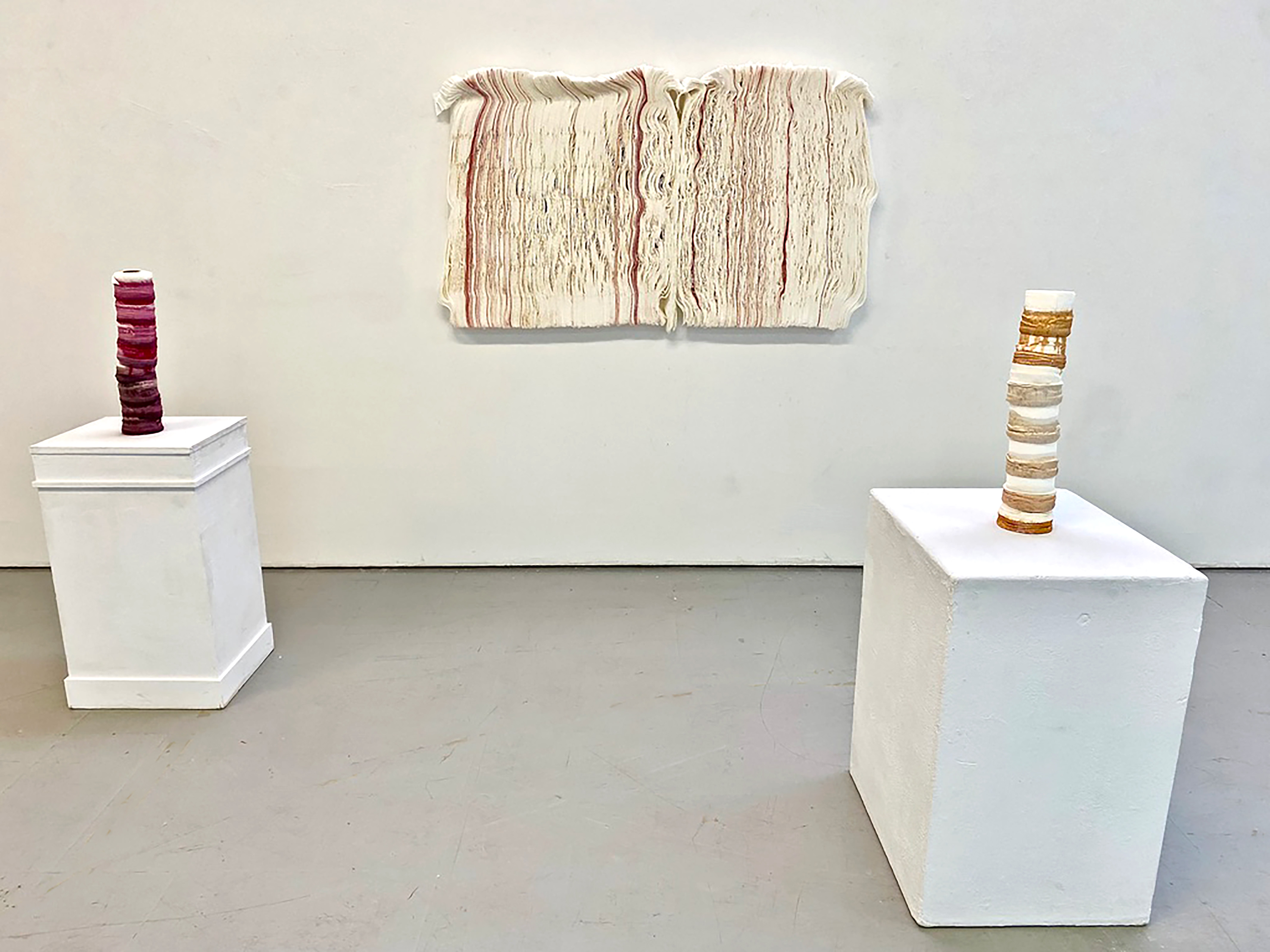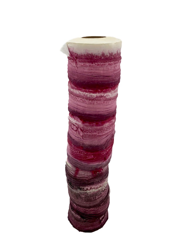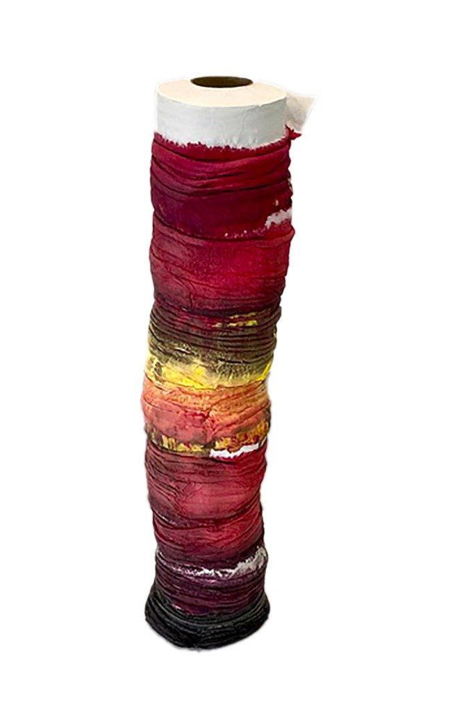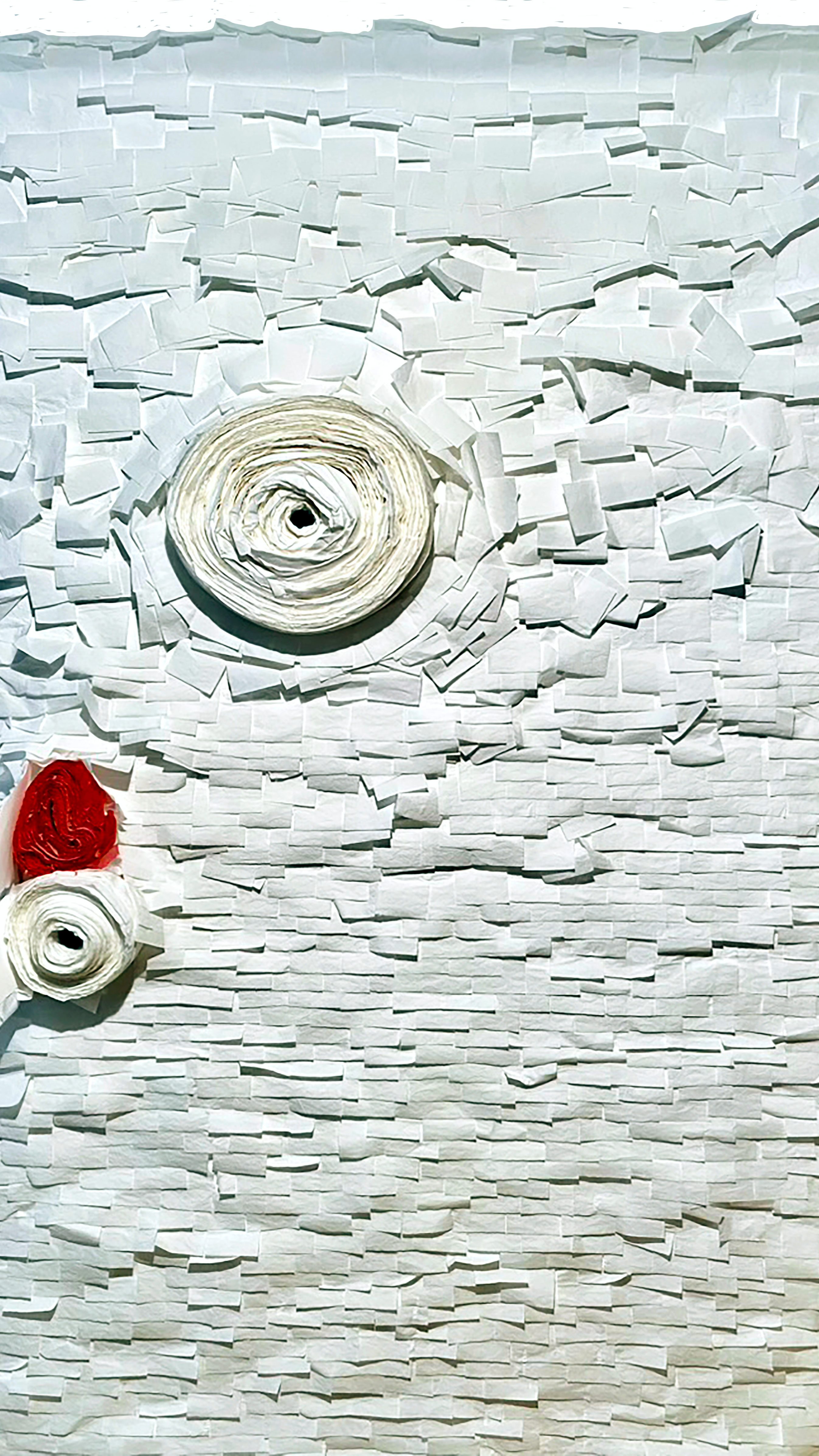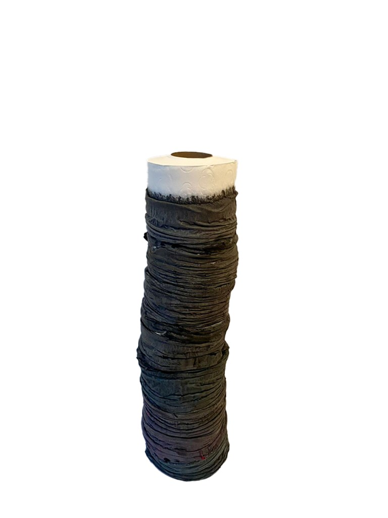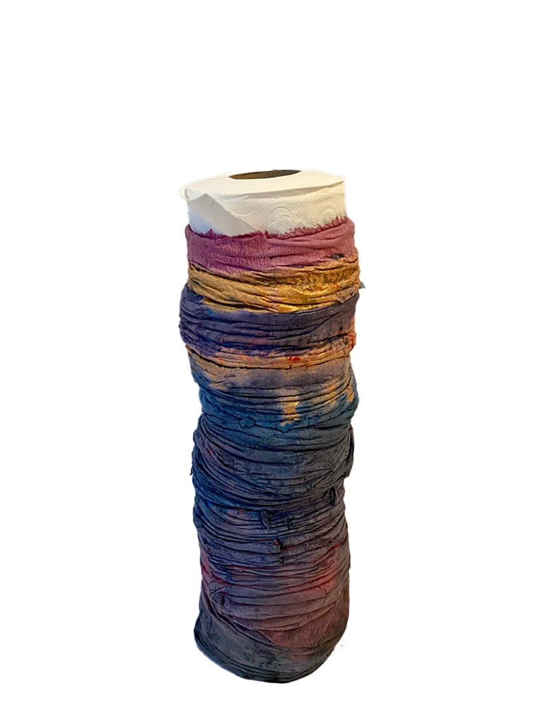 For Thanks but I’ve got my own, the base material of toilet paper is transformed into a desirable artistic object that parallels how, during the height of covid, the value of toilet paper skyrocketed as humans began to hunt for and hoard it.